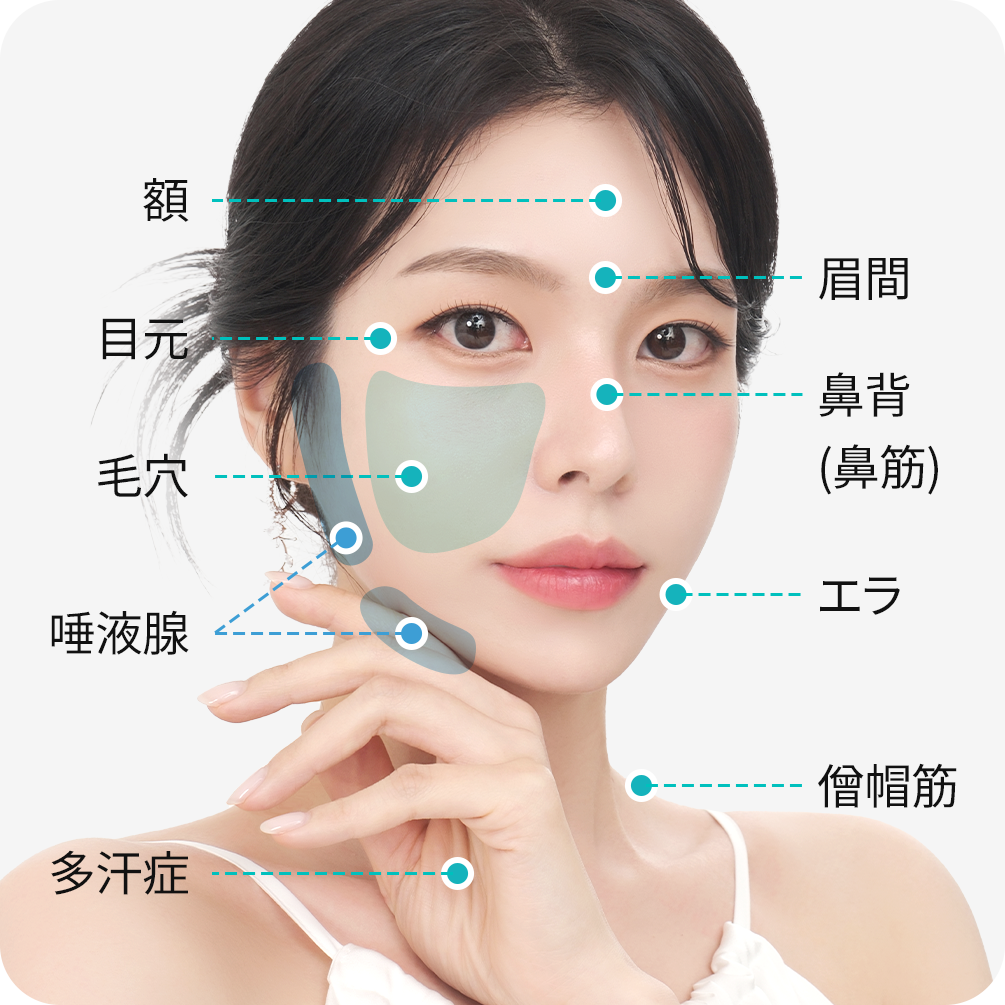 | - 額、眉間、目尻などの表情筋 - 咬筋(エラ) - 僧帽筋、ふくらはぎなどの体部位 |